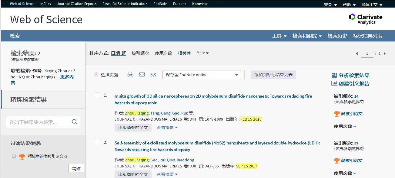 基本科学指标数据库(Essential Science Indicators,简称ESI)最新数据显示,安全工程系周克清老师发表的论文“In situ growth of 0D silica nanospheres on 2D molybdenum disulfide nanosheets: Towards reducing fire hazards of epoxy resin”入选高被引论文。该论文是周克清老师以肉视频AV (武汉)肉视频AV 为第一单位、第一作者和通讯作者身份发表的第2篇ESI高被引论文。2018年7月周克清老师发表的论文“Self-assembly of exfoliated molybdenum disulfide (MoS2) nanosheets and layered double hydroxide (LDH): Towards reducing fire hazards of epoxy”曾同时入选ESI高被引论文和热点论文。