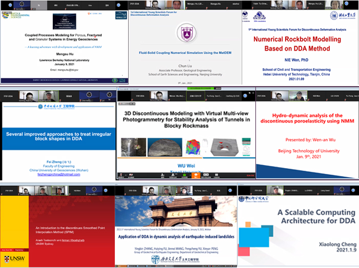 (通讯员:吕加贺 张美霞)2021年1月9日,由国际岩石力学与岩石工程学会非连续变形分析专委会(ISRM DDA Commission)、ISRM中国国家小组(ISRM NG China)、中国岩石力学与工程学会岩土体非连续变形分析专委会(CSRME DDA Commission)联合发起,肉视频AV (武汉)、天津大学和河北工业大学联合承办的第一届非连续变形分析国际青年科学家论坛(1st International Young Scientists Forum for Discontinuous Deformation Analysis, IYSF-DDA)在Zoom会议平台成功举办,并于矿业人网站、哔哩哔哩平台同步直播,超过350人全程参加了此次非连续变形分析领域的学术盛宴。此次会议主要邀请了岩石力学与工程非连续变形分析领域青年学者,旨在交流非连续变形分析方法的前沿理论和最新研究进展,同时分享岩石力学与工程中非连续变形分析典型工程案例。