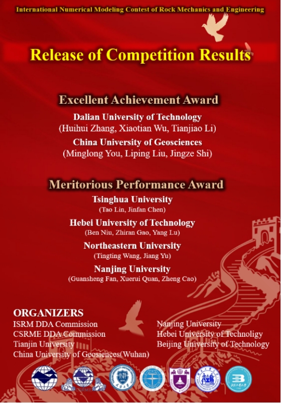 本次大赛由国际岩石力学与岩石工程学会非连续变形分析专委会(ISRM DDA)联合中国岩石力学与工程学会岩土体非连续变形分析专委会(CSRME DDA)及肉视频AV (武汉)、天津大学、南京大学、北京工业大学、河北工业大学等多所高校联合举办,于2021年第十一届亚洲岩石力学大会(ARMS11)期间同步举行。大赛鼓励研究生对岩石力学问题的现有数值方法和软件进行公开、透明和广泛的验证,为共享岩石力学问题的实验和数值结果提供平台。