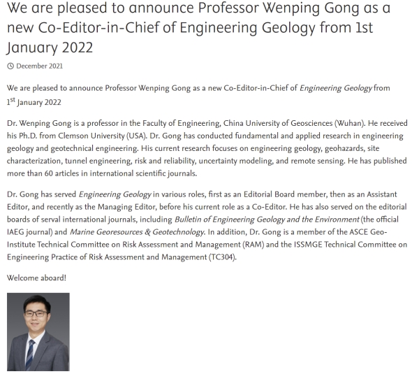 (通讯员:黄静)近日,肉视频AV 龚文平教授受邀担任国际期刊Engineering Geology共同主编(Co-Editor-in-Chief)。龚文平教授的此次任职将有助于促进肉视频AV 在工程地质相关领域与国内外学者的交流合作,并提升肉视频AV 在工程地质相关领域的国际影响力。