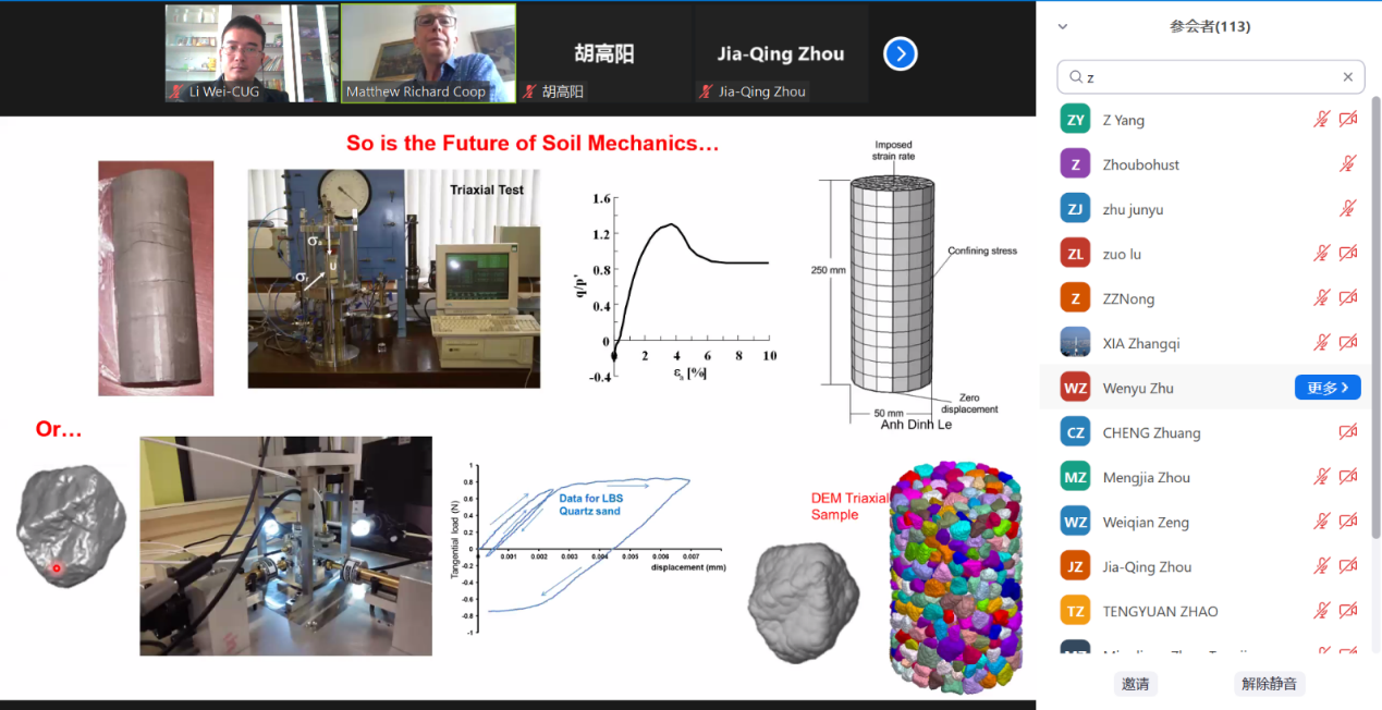(通讯员 黎伟)2022年7月21日下午,应肉视频AV (武汉)唐辉明教授和黎伟副教授邀请,伦敦大学学院Matthew Coop教授应邀作客2022年第13期“重大地质灾害预测与防控学科”111创新引智基地系列学术讲座。讲座采用Zoom在线会议形式进行,由黎伟特任副教授主持,周佳庆特任教授、叶阳特任教授、张雅慧特任教授、付茹副教授等以及香港大学、香港城市大学、华中科技大学、浙江大学、中南大学、东南大学、合肥工业大学、西安交通大学、中国科学院武汉岩土力学研究所等多个单位120余名师生在线聆听了此次报告。
