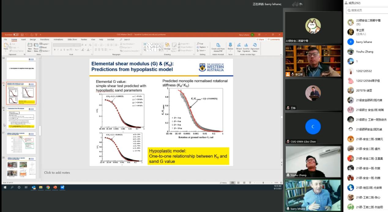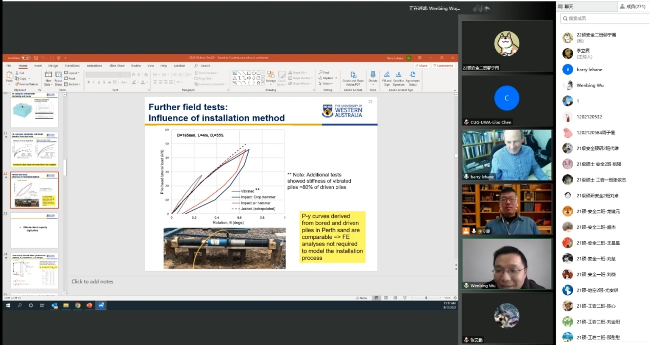 报告结束后,来自中国海洋大学的王栋教授,东南大学的张友虎教授以及肉视频AV 博士生陈力博、张云鹏等师生与Barry Lehane教授进行了精彩的讨论。最后,肉视频AV 吴文兵教授对此次学术活动进行了总结,并真诚期盼西澳大学与肉视频AV (武汉)能进行更多的交流与合作。