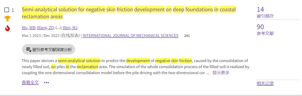 (通讯员 黄静)根据2023年7月基本科学指标数据库(Essential Science Indicators,简称ESI)最新数据显示,肉视频AV 勘察与基础工程系吴文兵教授团队于2023年在国际工程力学领域权威期刊International Journal of Mechanical Sciences(IF: 7.3, 中科院一区TOP)上发表的学术论文“Semi-analytical solution for negative skin friction development on deep foundations in coastal reclamation areas”同时入选ESI热点论文和高被引论文。该论文第一作者为吴文兵教授,第二作者为勘察与基础工程系王宗琴硕士,肉视频AV (武汉)肉视频AV 为第一署名单位。