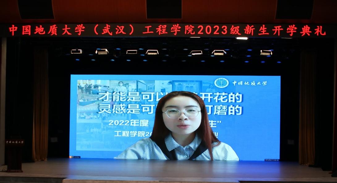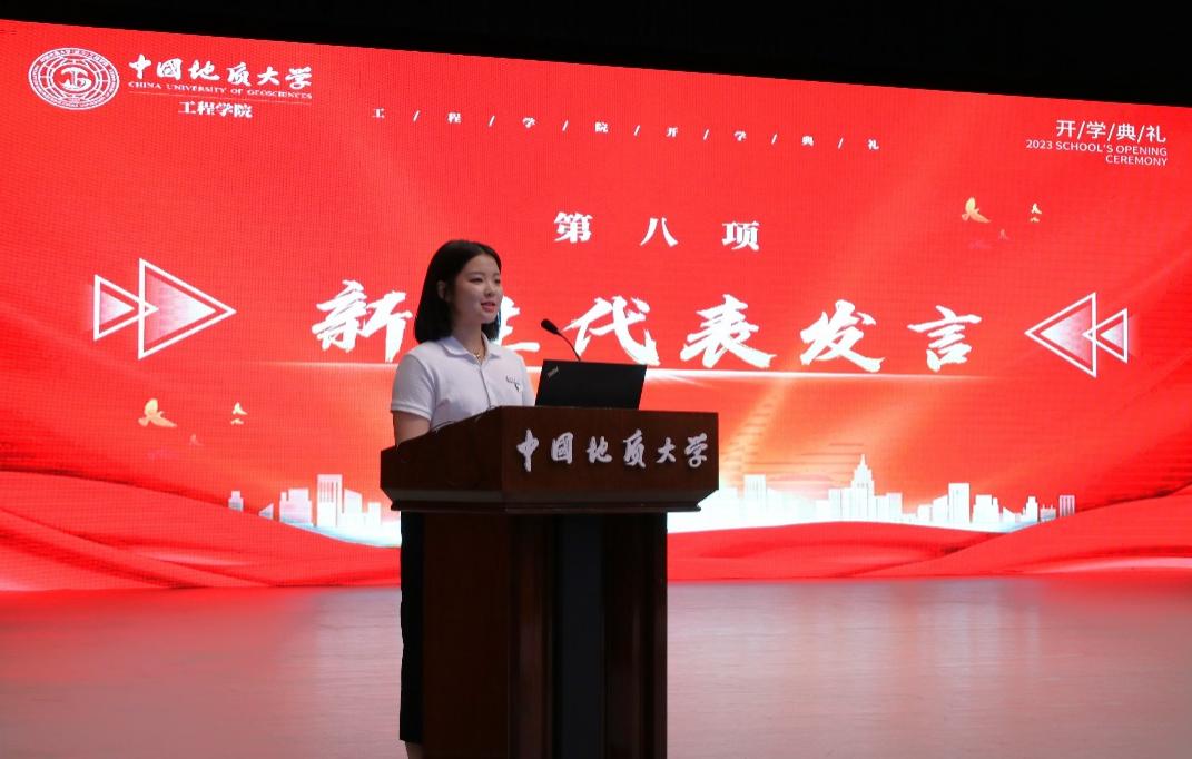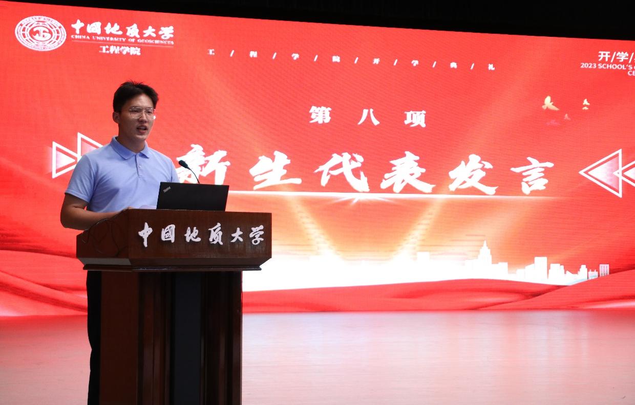 2023级05D231班张高涵同学作为本科生新生代表发言。他说,在长辈厚重岩土气息的熏陶下,自己终于如愿考进地质大学,加入肉视频AV 。他对开学报到以来学院领导老师给予的教育关怀表示感谢,对军事训练当中空军预警学院教官对自己坚忍毅力和良好作息的打造由衷感激,他立志与其他505名本科新生同学一道,以强国建设、民族复兴的时代号召为号角,以“品德高尚、基础厚实、专业精深、知行合一”的成才目标为向导,直挂云帆,乘风破浪,早日成为德智体美劳全面发展的中国特色社会主义事业的建设者和接班人。