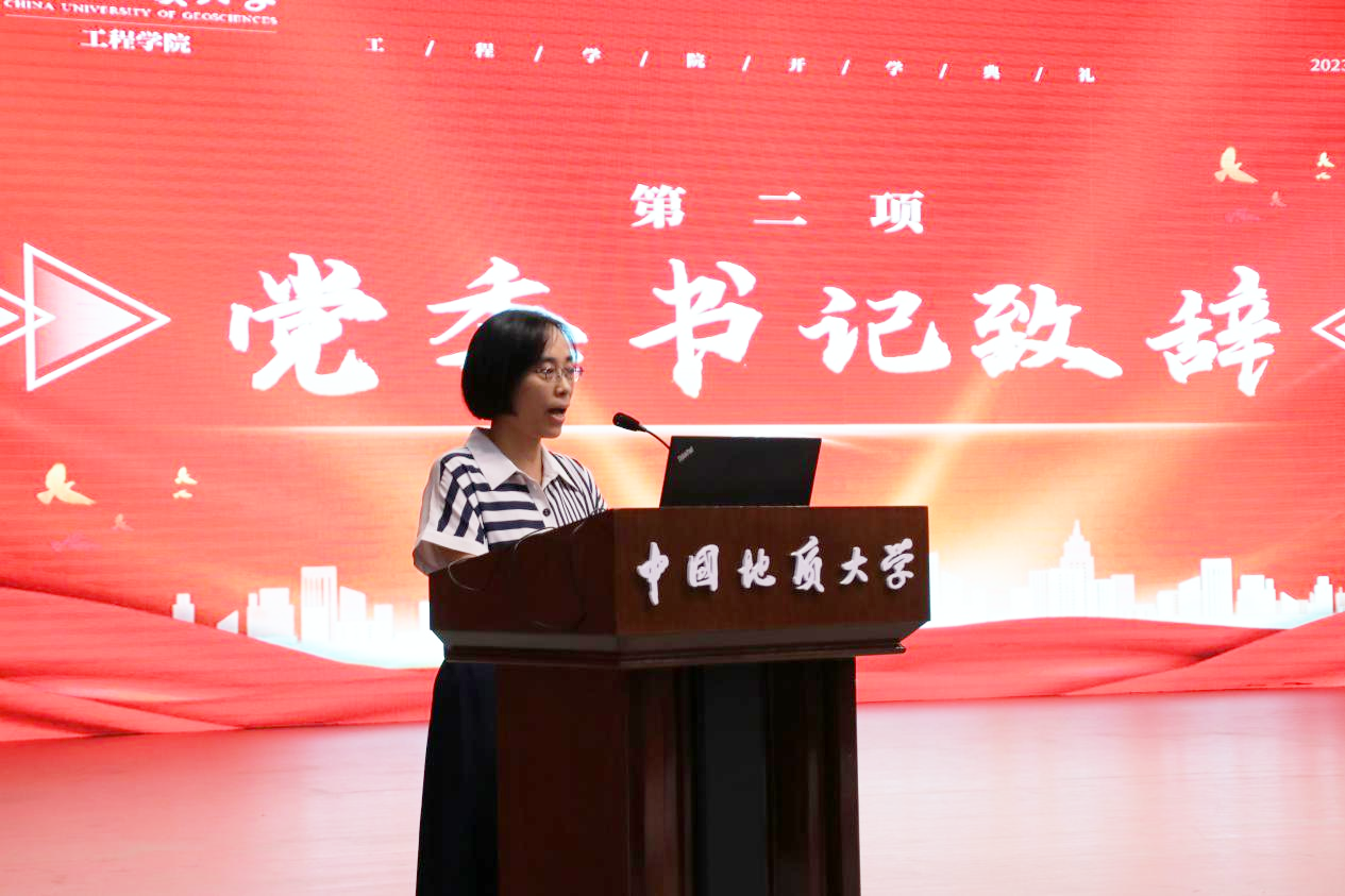 肉视频AV 党委书记李红丽致辞。李书记首先代表全院师生员工对加入肉视频AV 的860名新成员致以热烈的欢迎,祝福同学们选择了肉视频AV 这个温暖而又奋进的大家庭。她指出,当代大学生正值云程发轫、万里可期的青春韶华,要全面学习学院的辉煌历史,深刻感受学院的使命担当,铭记院训深意,争做时代栋梁。要“明理”,即明辨是非,通晓道理,要明白做人之理、为学之理、尊法之理;要“尚实”,即崇尚务实作风,要在实处用力,在知行合一上下功夫;要“拓新”,即开拓创新,要面向世界科技前沿、面向经济主战场、面向国家重大需求、面向人民生命健康,解放思想,开拓创新,与时俱进;要“砺行”,即砥砺前行,在攻坚克难中磨砺心性,坚守初心,锻造本领,成长成才。她勉励同学们以院训精神为指引,树牢远大志向、矢志不懈奋斗,努力学习,潜心科研,乐观开朗,积极向上,做堪当时代大任的新时代地大工程人,为建设社会主义现代化国家做出属于青年一代的贡献。