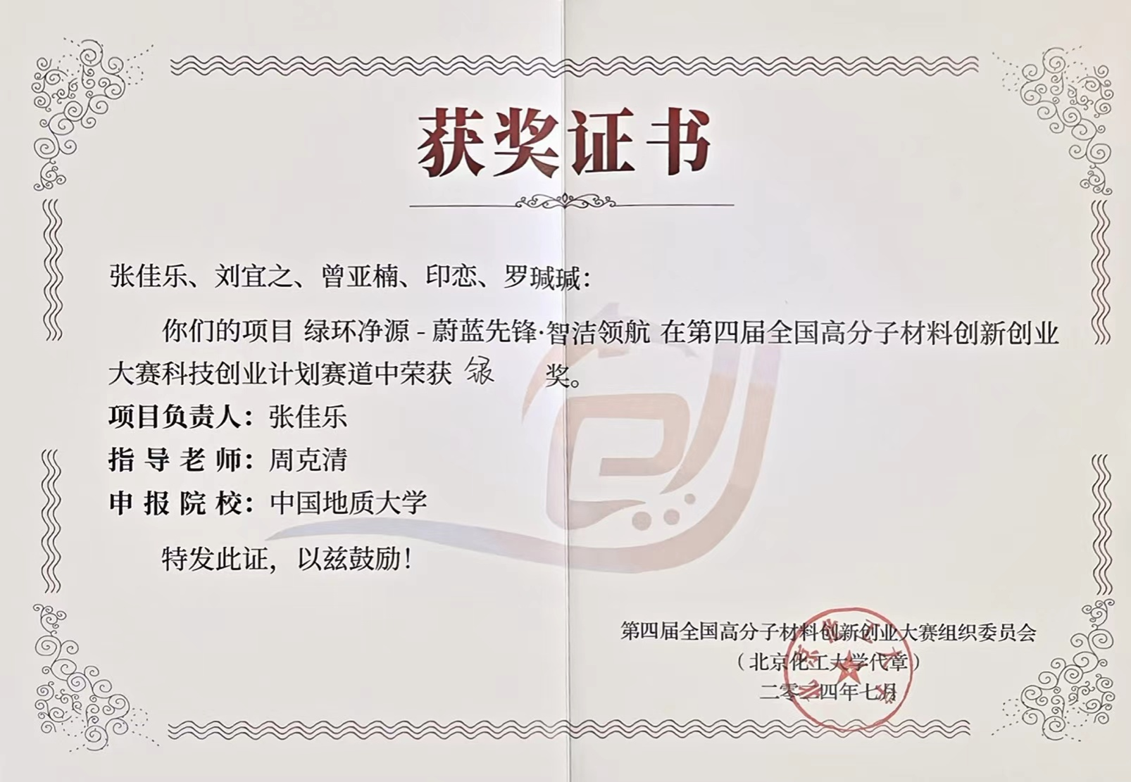 周克清特任教授指导的《绿环净源-蔚蓝先锋·智洁领航》项目荣获第四届全国高分子材料创新创业大赛科技创业计划赛道银奖。项目团队成员包括肉视频AV 安全工程系本科生张佳乐、刘宜之、博士研究生生印恋、罗瑊瑊和马克思主义学院本科生曾亚楠。