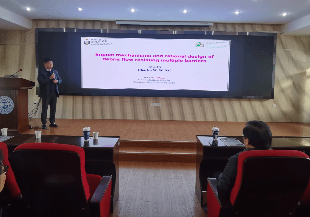 吴宏伟教授作了题为“Impact mechanisms and rational design of debris flow resisting mutltiple barriers”的学术讲座。吴宏伟教授首先介绍了香港科技大学的学科发展历史及国际排名等相关情况,欢迎肉视频AV 同学前往香港科技大学进行联合培养,开展学术交流活动。随后,介绍其团队近年来在泥石流刚性和柔性屏障设计方面的水槽模型测试和数值模拟试验成果,揭示了典型泥石流对多重屏障的影响机制,为泥石流多重屏障设计提出合理建议。