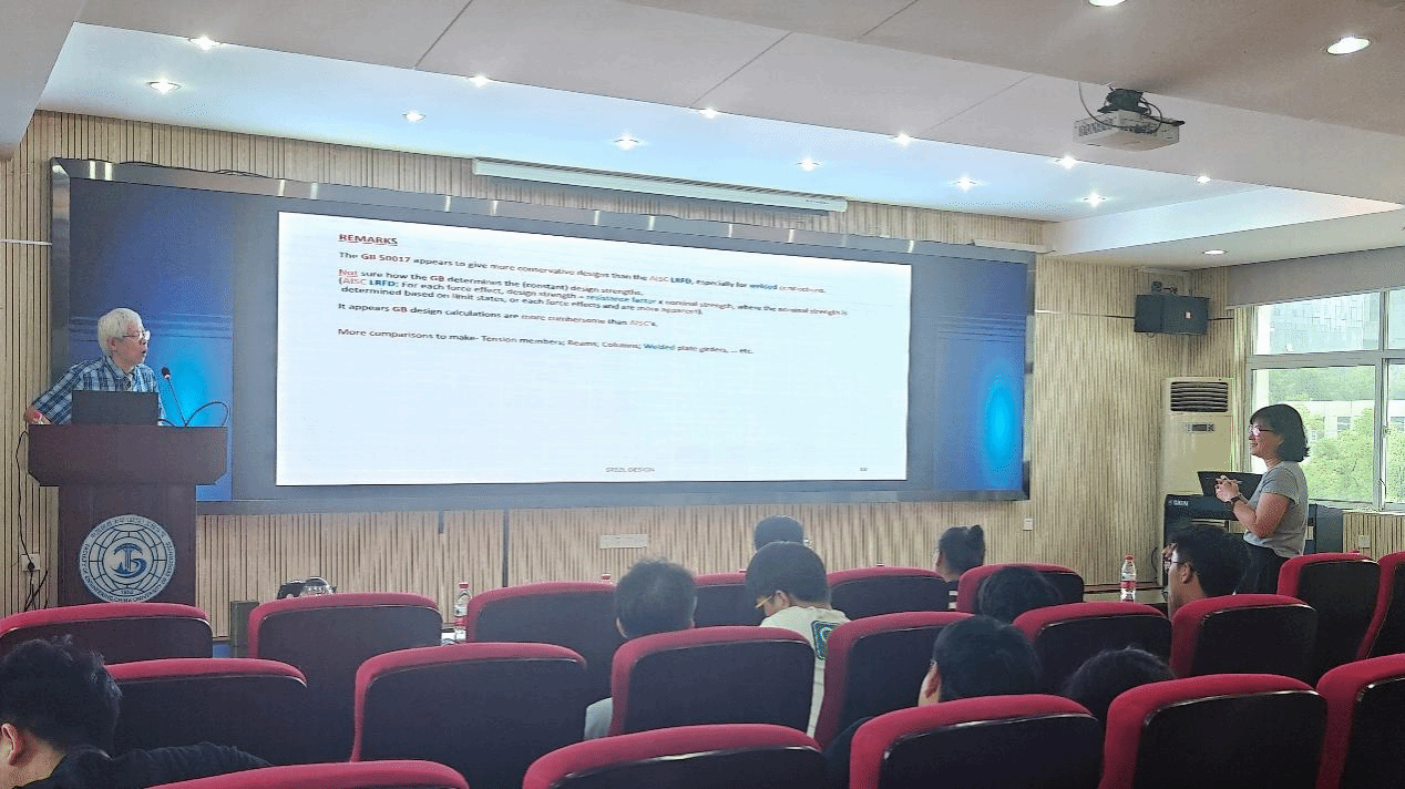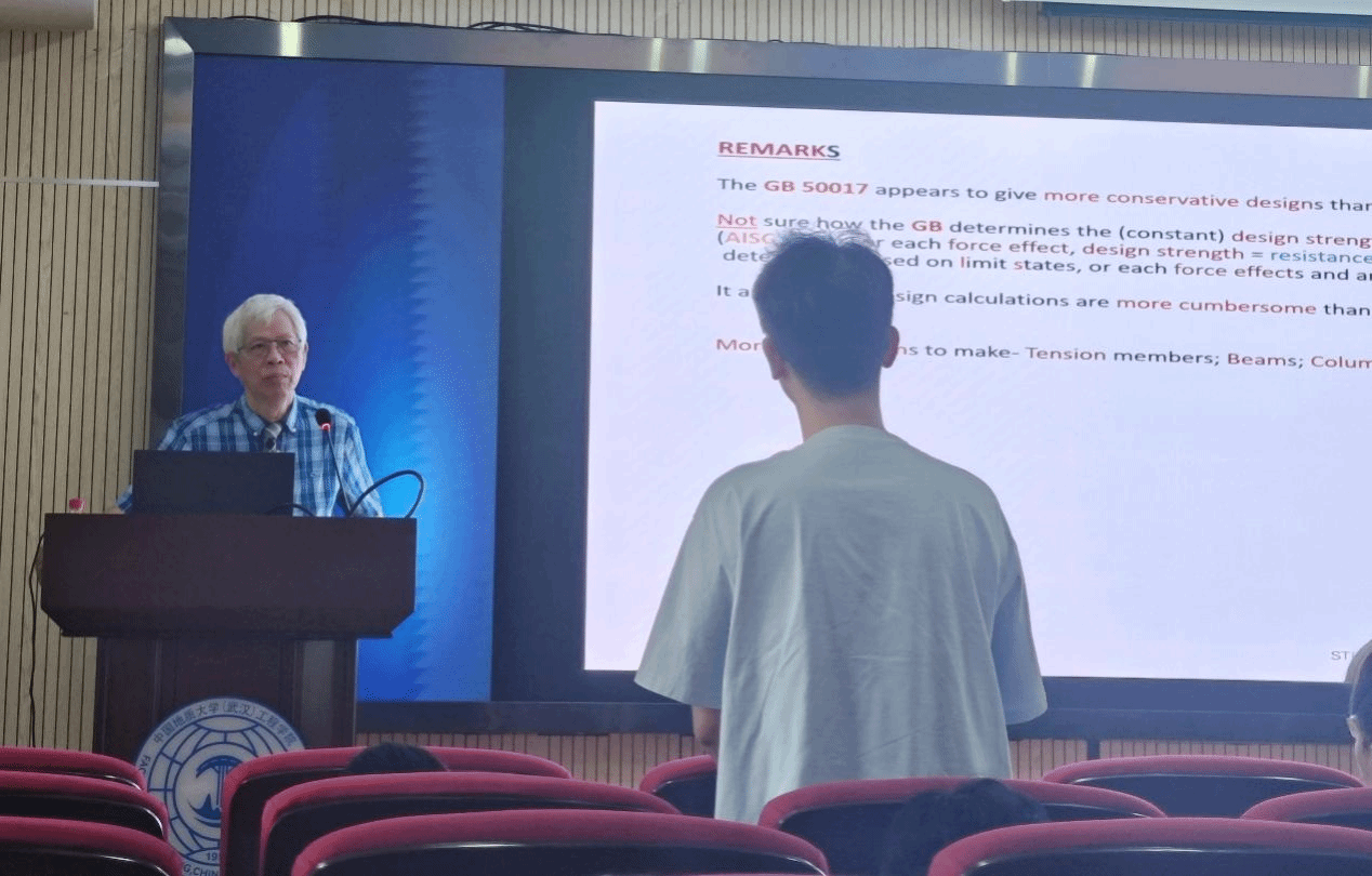 在提问环节,参会师生就中外规范差异明显的情况下,在国际项目中如何平衡规范选择,确保既满足设计要求,又便于项目施工与验收;中美两国钢结构设计规范的差异带来了哪些主要挑战;未来是否有可能推动规范的融合或实现互认等问题进行了深入交流讨论。