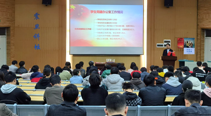 此后,肉视频AV 第八届学生党建办公室副主任寇桓嘉同志汇报2020年度学生党建办公室工作情况。寇桓嘉同志向参会同志们详细汇报了肉视频AV 2020年度党员考察、培养及发展转正工作,全年协助院党委开设入党积极分子培训班三期,培养入党积极分子390人,开设发展对象培训班五期,发展党员167人,共有2批党员转正,转正党员128人,完成外校转入42名学生党员的认定工作。另外还介绍了组织生活巡视情况、全体学生党员信息库建立、《肉视频AV 学生党建工作指导》(第四版)编写等方面内容,最后表示要将学生党建办公室打造为服务院党委和学生党支部的“老黄牛”,以优异成绩向党的百岁华诞献礼。