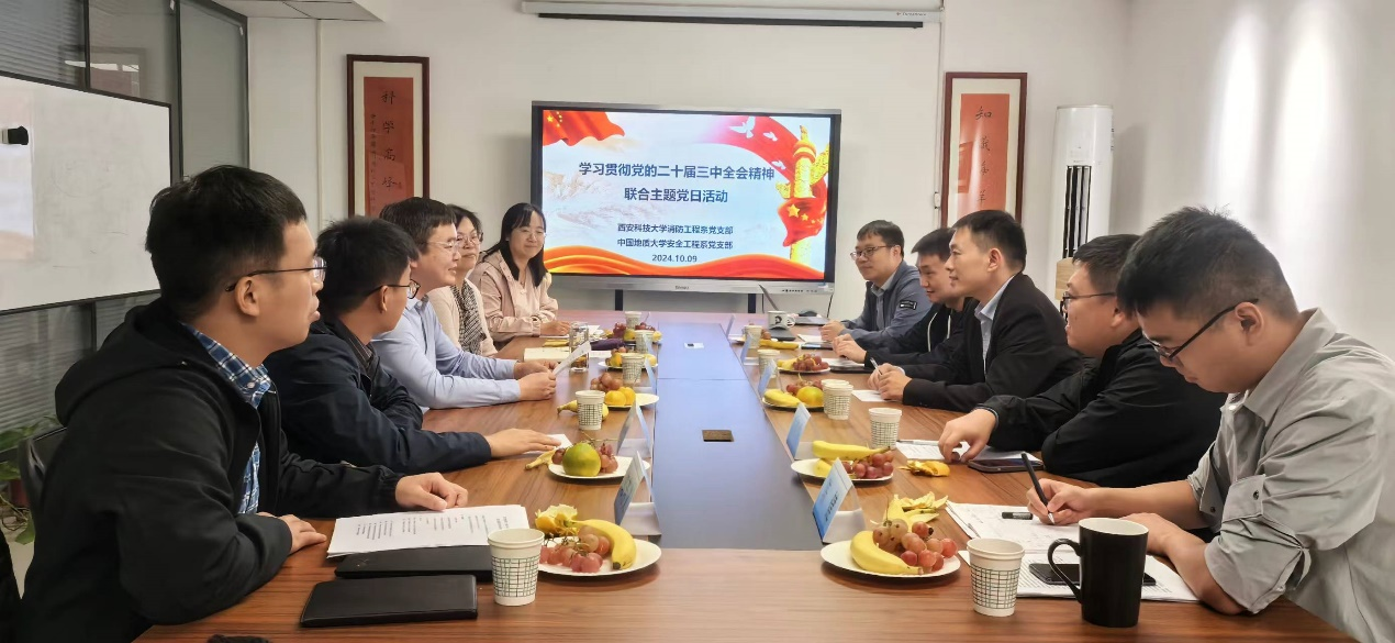 (通讯员 周克清、王涌宇)为深入贯彻落实党的二十届三中全会精神,坚定理想信念,强化交流合作,积极投身立德树人和科研攻关创新,10月9日上午,肉视频AV 安全工程系党支部书记周克清、支部党员陆凯华、王涌宇前往西安科技大学,与安全学院消防工程系党支部联合开展“学习贯彻党的二十届三中全会精神”主题党日活动。西安科技大学安全学院副院长兼消防工程系党支部书记马砺教授、系主任张嬿妮教授、党支部副书记盛友杰、组织委员王翠霞、纪检委员郭芳义等党员代表参加活动。