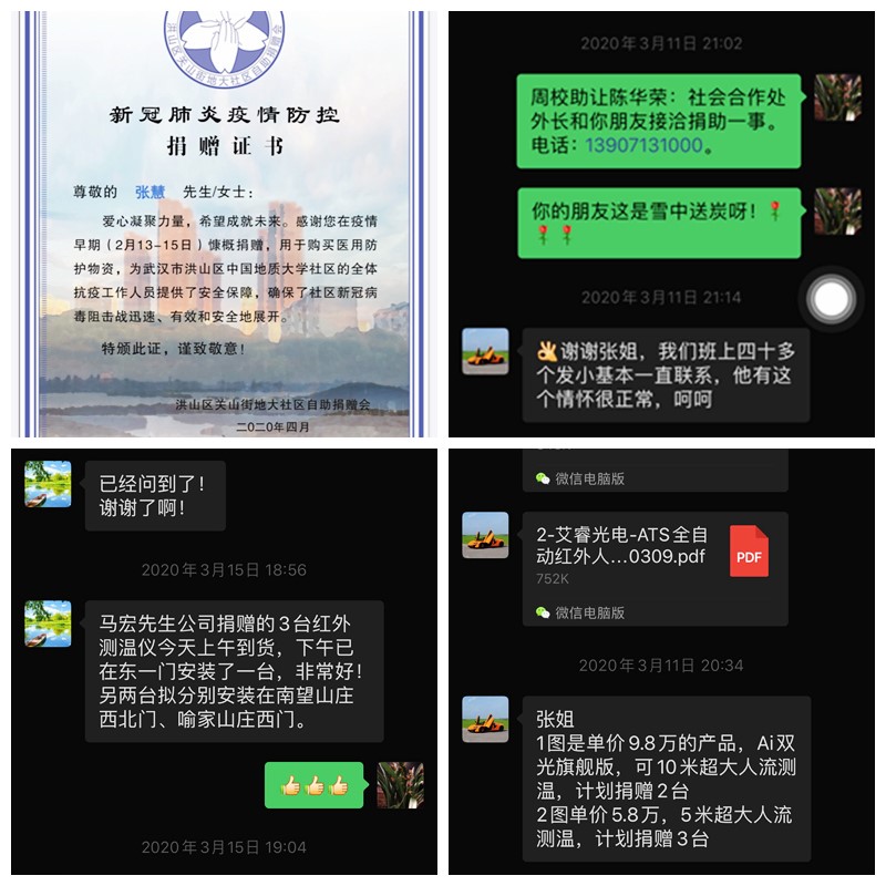 实验中心张慧同志是肉视频AV 喻家山庄业主委员会主任。疫情爆发后,她迅速联系业委会委员,配合居委会发布通告,及时了解学校及小区居民的发病人员情况。在物业管理人员缺乏,小区消杀物资有限的情况下,组织成立业主自救小组,将业主中的医务人员充实到组织中来。借助学校物业管理的能力对小区的公共区域进行大规模的消杀.多方联系团购渠道,为小区居民提供了便利。进一步完善各楼栋单元的QQ群,摸清现在居住在小区的住户名单及家居人口数。在缺乏防护物质的前提下,不等不靠,组织业主捐款购买护防装备提供给医护人员,保卫人员,社区工作人员,物业管理人员及小区志愿服务人员。在张慧同志的带领和组织下,广大业主积极响应,共筹得善款十七万余元。同时,张慧同志联系到烟台睿创维纳技术股份有限公司的朋友,给肉视频AV 捐赠了三台ITS智能红外体温检测设备,分别投入到学校东一门、南望山庄西北门和喻家山庄西门使用,大大提高了体温的检测效率和准确性。