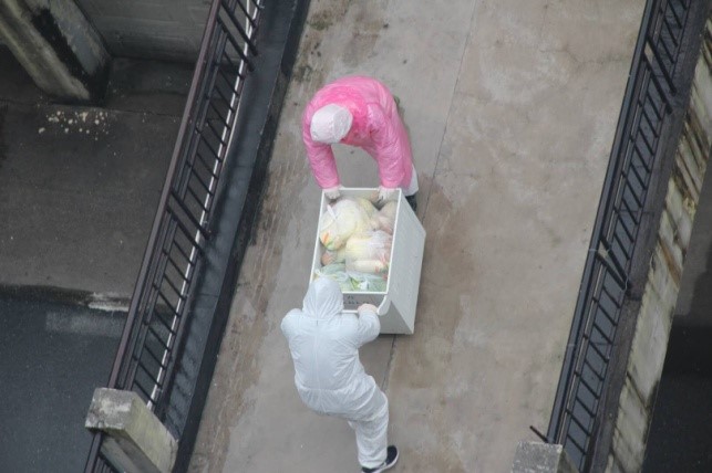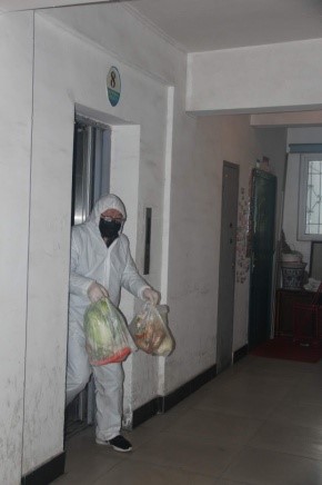 董道军同志这种不计个人安危,任何时候都把他人利益放在首位的精神,体现了一名共产党员的优秀品质。下图为董道军同志在疫情期间做为突击队员为住户运送物质。